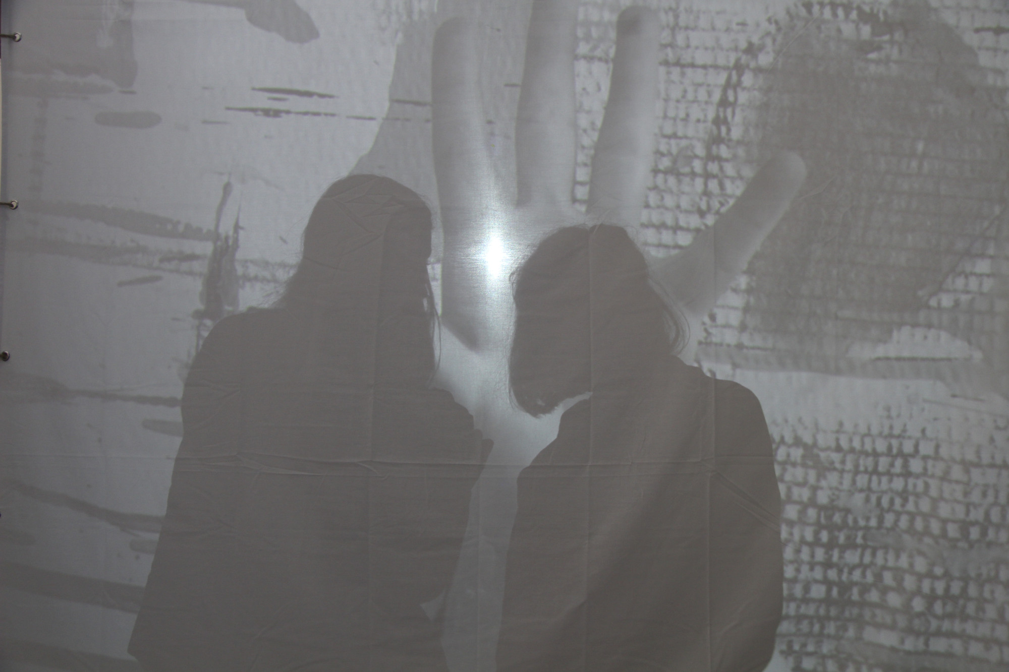 Although Eva made suggestions, the students were encouraged to feel things out by themselves; to see what was fun and what felt good. Lots of them loved playing in front of the projector screen, realising that they could see each other's shadows dancing on the opposite side. Jaz looked at one of her school friends' stretched-out sillhouettes, and laughing at the wacky proportions, she was reminded of Wilmington's Long Man, a chalk drawing in the landscape that the school bus had driven past on the way down. Behind the screen, they could be big or small, tall or short, scary or funny...
