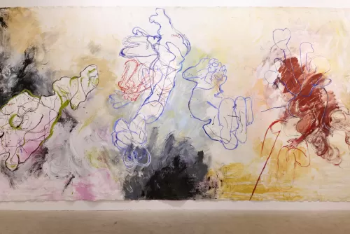 Florence Peake's monumental painting installation embodies her distinctive gestural, movement-marking techniques. This new, 50m long painting was created through a series of workshops held at Southwark Park Galleries in November 2022.
