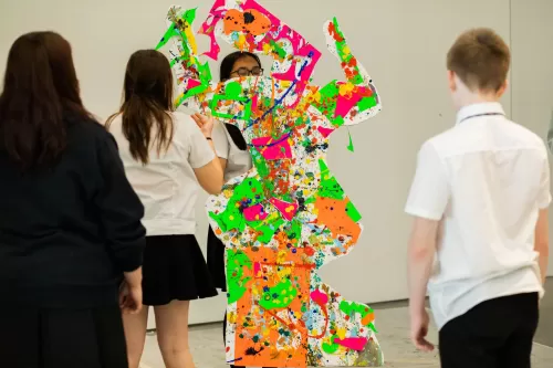 This artwork by the self-titled Nibble Bibble Duck Toes (An arts collective of Turing School pupils) was made during workshops responding to the Turner Prize 2023 with artist Richard Phoenix