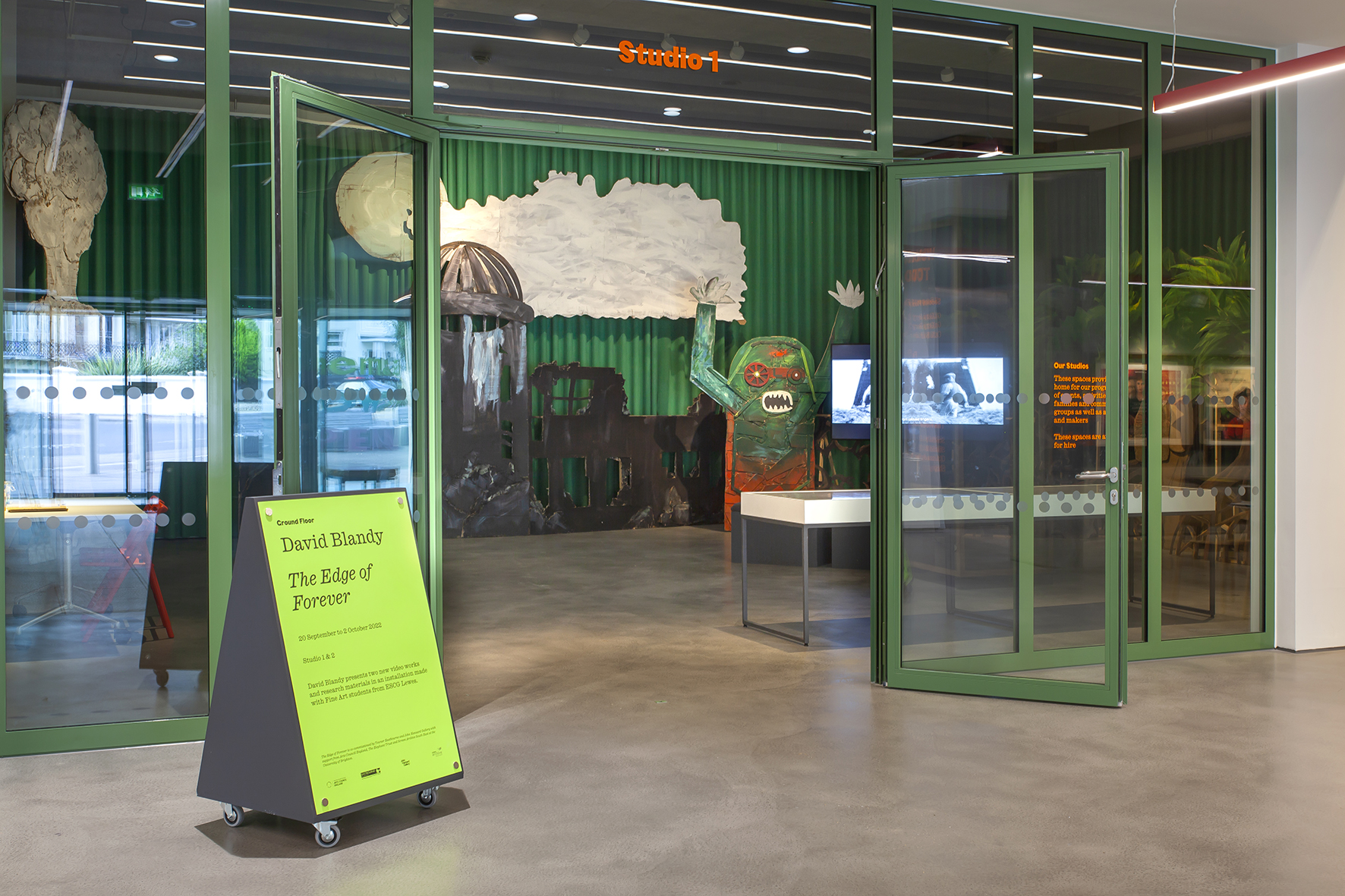 The exhibition also includes a collaboration with Fine Art students from East Sussex College Lewes. The students worked closely with Blandy to create an outsized children’s fantasy. Together they reimagined key scenes from the film, enlarged and built out of cardboard, from observatory domes, mangrove roots to figures, all rendered in the style of theatre flats, that will populate the ground floor studios